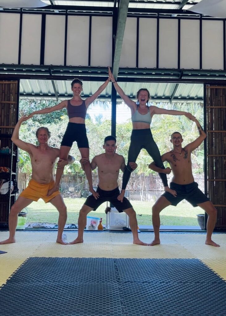 Join the Koh Phangan AcroYoga community to practice your skills. All levels including beginners are welcome. Come by yourself or with a partner and have fun!