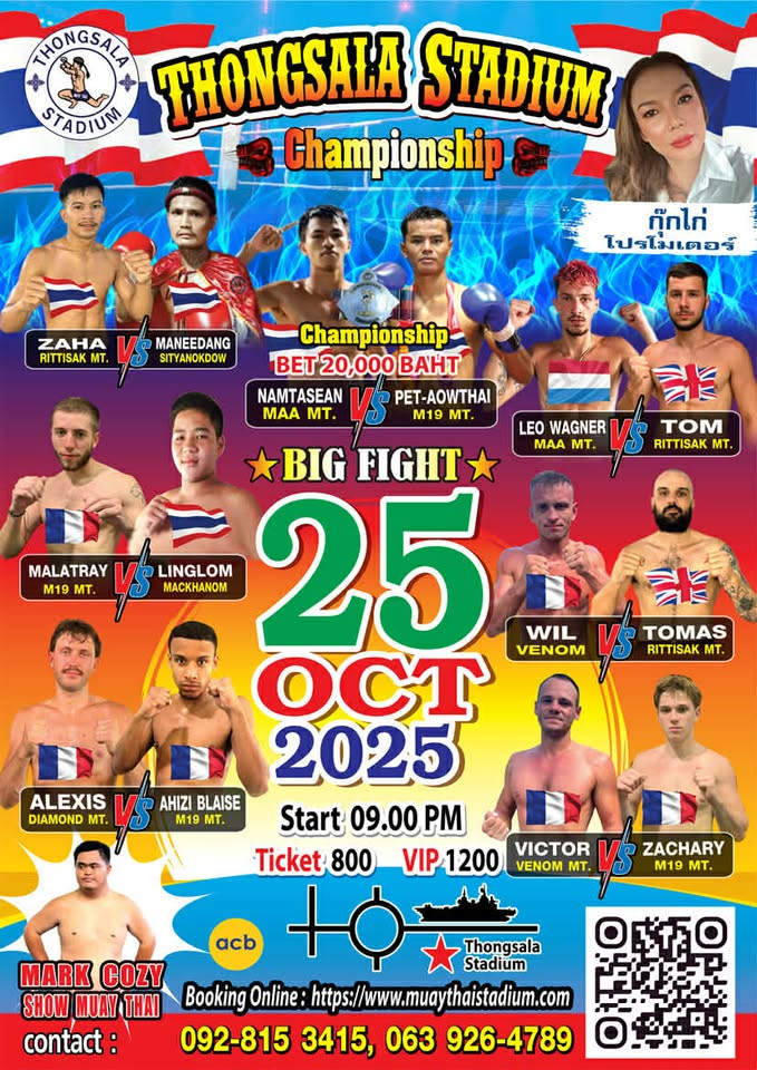 - Tickets: 800 baht standard, 1200 baht VIP ringside