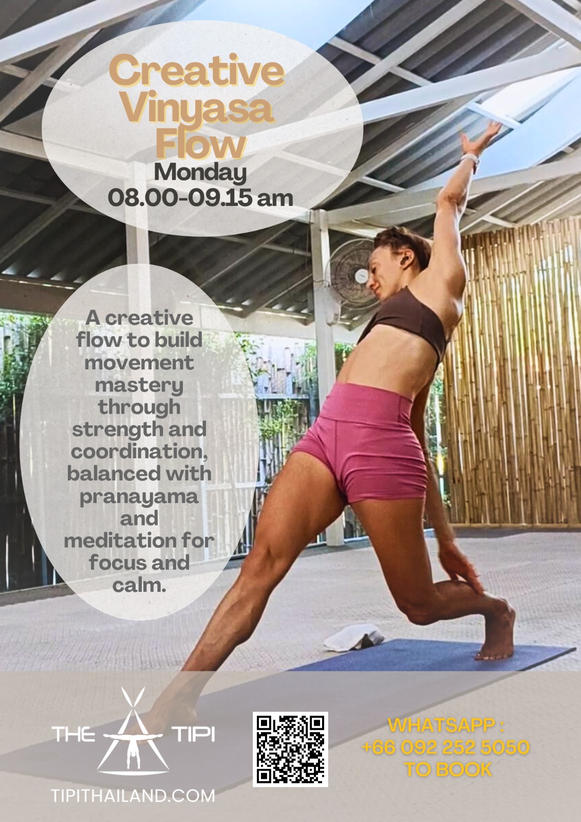 Smooth transitions, Flowy practice 🍃A creative and dynamic practice that flows with the breath. We explore intelligent sequences that balance strength, mobility, and softness — leaving you energized yet grounded. Class always includes pranayama to center the mind and a short meditation to close, so you walk away with both physical vitality and inner calm. 🌿🧘♀️
